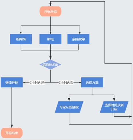 (1)平台信息技术岗可尝试使用无线等其它应急网络继续评标。若更换为无线及其它应急网络可正常评标,或经简单维修可快速排除故障的,在平台采购管理岗见证下,可按计划正常评标;