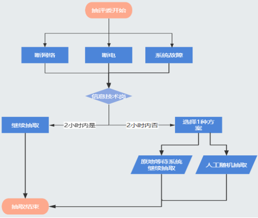 (1)平台信息技术岗可尝试使用无线等其它应急网络继续评标。若更换为无线及其它应急网络可正常进行专家抽取,或经简单维修可快速排除故障的,在采购人见证下,可按计划正常进行专家抽取。